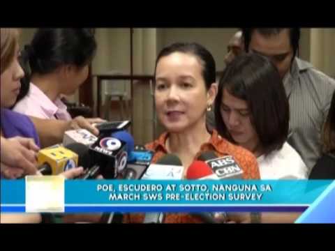 MANILA, Philippines – In the pre-election survey conducted by the Social Weather Station from March 4 to March 7, Senator Grace Poe took the lead among the presidential candidates with 27% while Vice President Jejomar Binay garnered 24%. For the candidates for vice-president, Senator Chiz Escudero took the lead with 28% followed by Senator Bongbong Marcos with 26%. For the senatorial candidates, Senator Tito Sotto took the lead with 53%. (Eagle News Service Described by […]