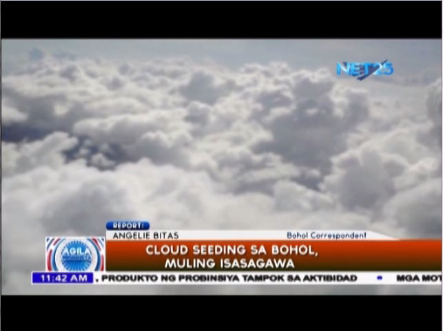 HULYO 15 (Probinsya) — Muling magsasagawa ng cloud seeding na magsisimula ngayong ikatlong linggo ng Hulyo 2015 ang lalawigan ng Bohol. Ang isasagawang cloud seeding ay upang mapunan ang kakulangan ng tubig sa kanilang dams sa nasabing probinsya. Sa cloud seeding na ito, tinatayang aabot sa 1.8 milyong piso ang gugulin ng gobyerno. (Agila Probinsya Correspondent Angelie Bitas)