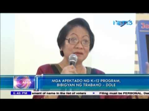 MANILA, Philippines (Eagle News) – The Department of Labor and Employment assured the teaching and non-teaching staff that will be displaced by the implementation of the K-12 program will be prioritized by the said department through the giving of assistance in finding new jobs. (Eagle News Service Jay Paul Carlos, Jericho Morales, Vince Alvin Villarin) https://youtu.be/JCI3JPxdXi4
