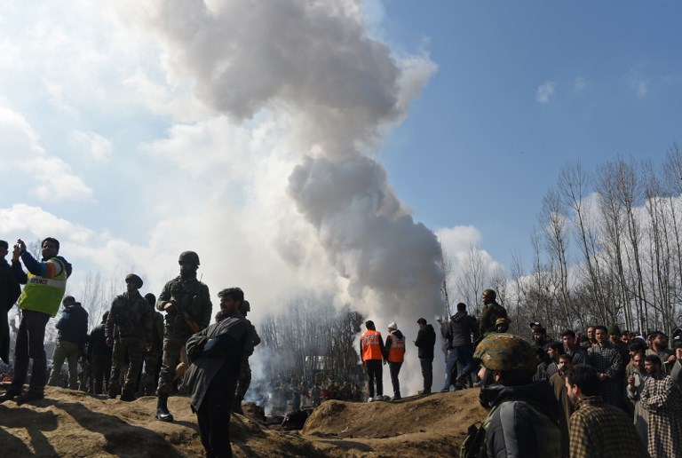 Indian soldiers and Kashmiri onlookers stand near the remains of an Indian Air Force helicopter after it crashed in Budgam district, outside Srinagar on February 27, 2019. – Officials said an investigation was underway into the cause of the crash, which came as Pakistan claimed to have shot down two Indian fighter jets in the divided and disputed Kashmir region. (Photo by Tauseef MUSTAFA / AFP)