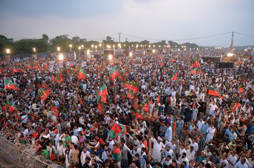 Around 20,000 supporters of Pakistan’s main opposition leader Imran Khan crowded into an arena on July 30 for a rally — dubbed the “Thanksgiving Rally” — to celebrate after the Supreme Court disqualified Nawaz Sharif following an investigation into corruption allegations against his family. / AFP PHOTO /