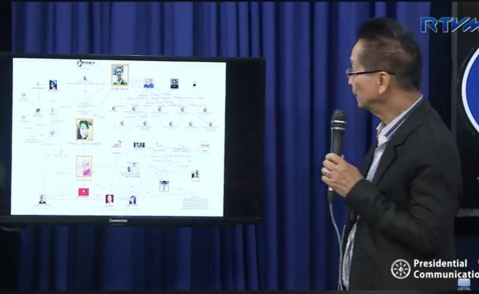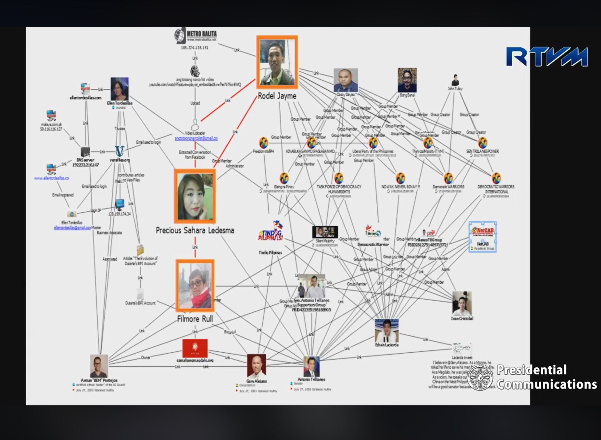 Panelo, together with Press Secretary Martin Andanar, gave a detailed presentation showing the diagram of connections of those allegedly behind the production and distribution of the Bikoy video series, including voice analysis of the alleged “Bikoy” and the narrator in the video.