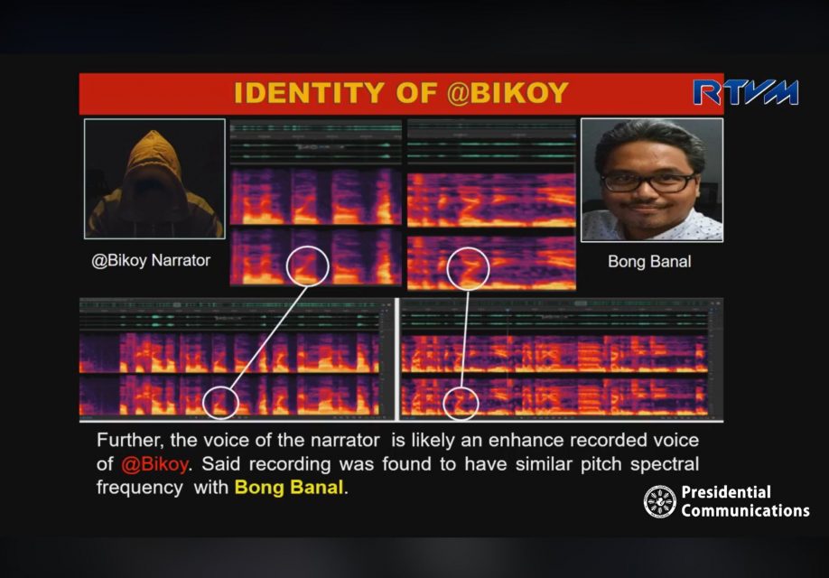 He also named the narrator in the Bikoy video, based on voice analysis, as a certain “Bong Banal” who is said to be a photojournalist and an administrator and member of “significant anti-Duterte and LP-leaning Facebook groups/pages actively circulating propagandas within the different social media platforms alongside Jayme Rodel.”