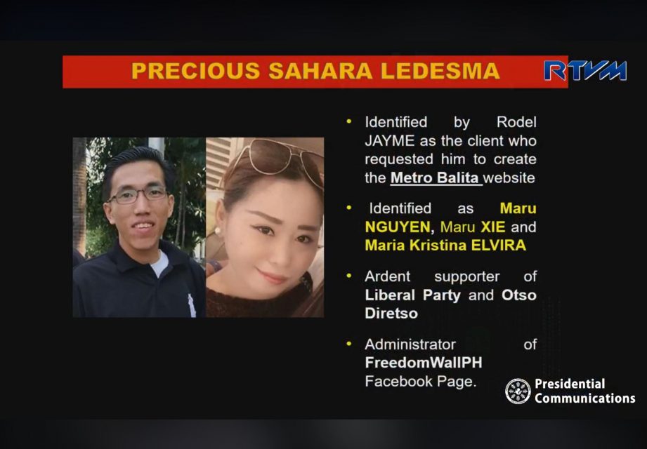 He showed the other contacts of Jayme, including a certain Precious Sahara Ledesma who is said to be the Maru Nguyen, or Maru Xie and Maria Kristina Elvira. Ledesma is said to be in charge of the FreedomWallPH Facebook page.