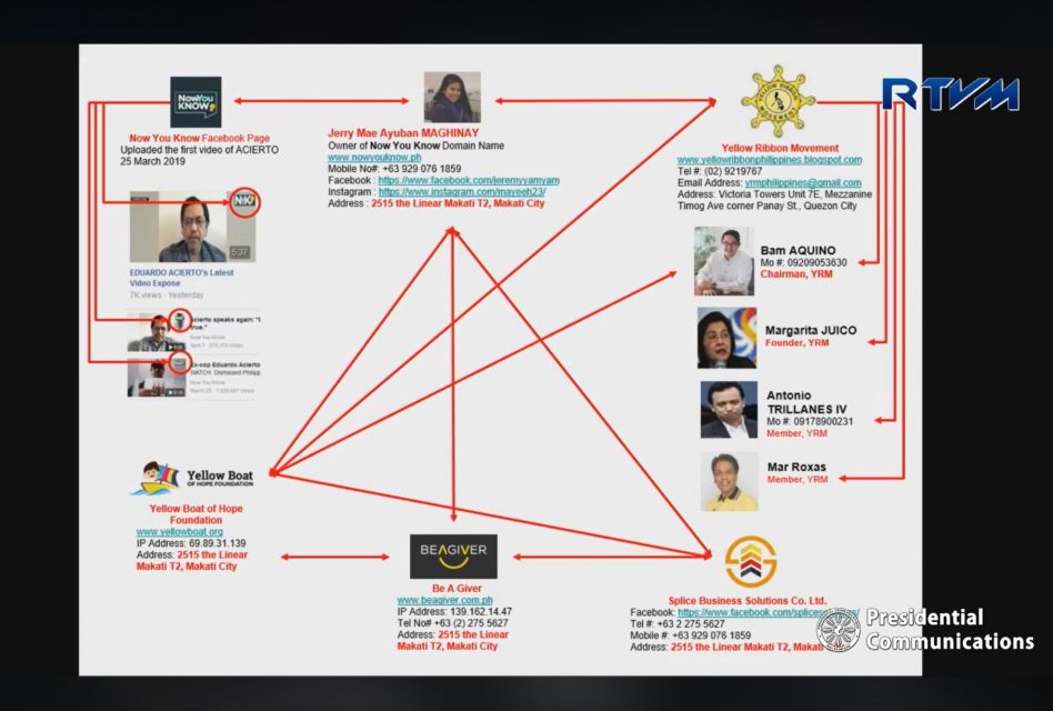 “Intelligence information showed that some of them are using the same office – a 40 square meter office, and personalities like Bong Banal, Cocoy Dayao.. they are all known advocates of the Liberal Party.. even their email address appear to be the ones sharing the video of Bikoy,” Panelo said in his media briefing.