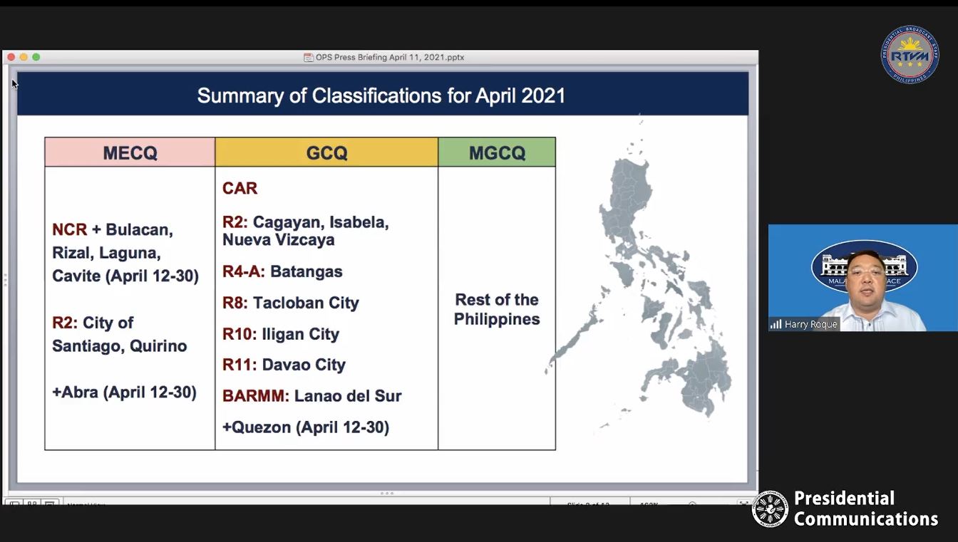 Presidential Spokesperson Harry Roque said that President Duterte approved the recommendation of the IATF to place these areas under the new quarantine classifications for the rest of April provided that there would be more COVID-19 beds, both ICU and ward beds, to be dedicated in various hospitals especially those in the NCR Plus areas. He said that a total of 3,156 COVID beds in NCR plus had been added as of April 11. Of this number, 164 are ICU beds for critical cases, 2,227 are COVID regular beds for moderate to severe cases, and 765 are COVID isolation beds for mild and asymptomatic.