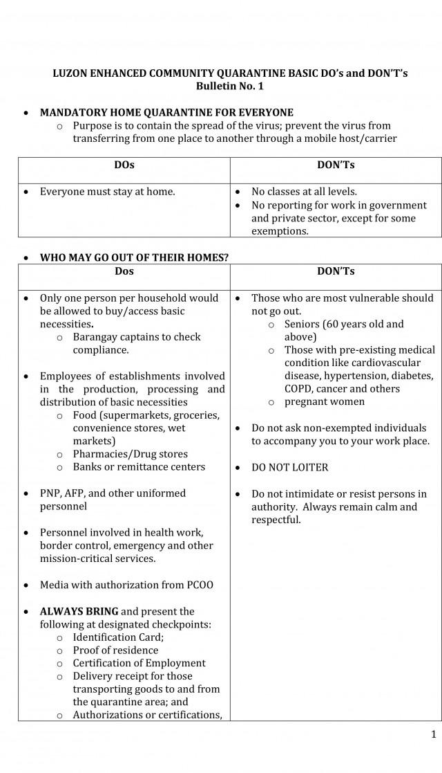 (Eagle News) — The Palace on Wednesday, March 18, released the do’s and dont’s during the enhanced community quarantine on Luzon.