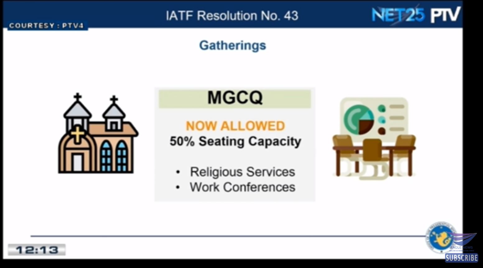 Outside of these areas, or those under MGCQ, religious services can be held provided attendees would be limited to 50 percent of the seating capacity of religious service venues.