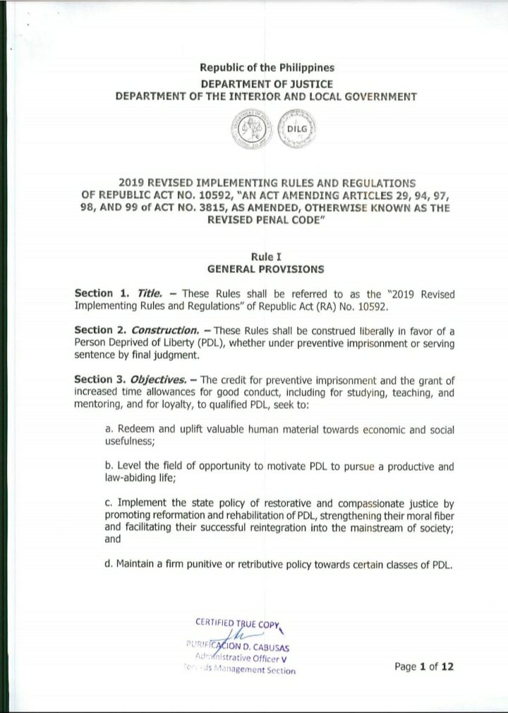 (Eagle News)–The Palace on Tuesday, Sept. 17, welcomed the signing of the revised Implementing Rules and Regulations of the Good Conduct Time Allowance law.