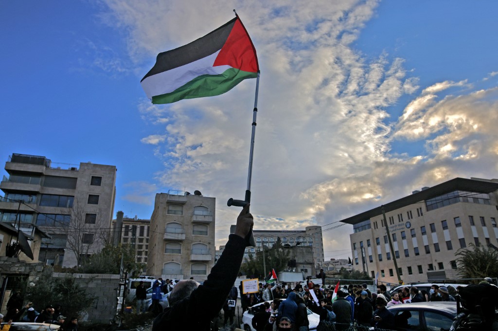 Palestinians gather during a demonstration in the east Jerusalem neighbourhood of Sheikh Jarrah, on December 17, 2021. (Photo by AHMAD GHARABLI / AFP)
