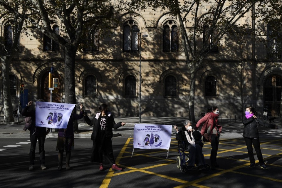 Women form a human chain as part of a protest called by feminist associations in Barcelona on November 22, 2020, ahead of the International Day for the Elimination of Violence against Women, on November 25. (Photo by Pau BARRENA / AFP)