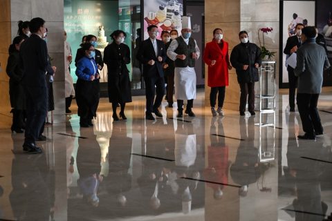 Hotel workers wearing protective masks exercise in the lobby during a staff briefing about how to implement new regulations concerning the current situation in Wuhan in China’s central Hubei province on January 28, amid a deadly virus outbreak in the city. (Photo by Hector Retamal / AFP)