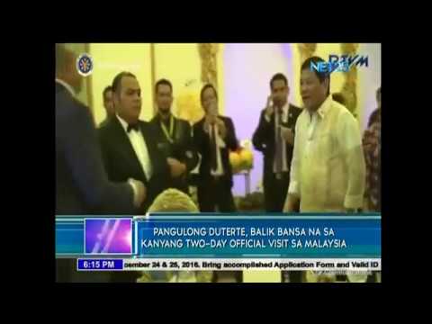 Ikinagalak ni Pangulong Rodrigo Duterte ang magandang resulta ng kanyang two-day official visit sa Malaysia. Sa kanyang arrival press conference, ibinahagi ng pangulo ang ilan sa mga napagkasunduan sa kanyang bilateral meeting kay Prime Minister Najib Razak.