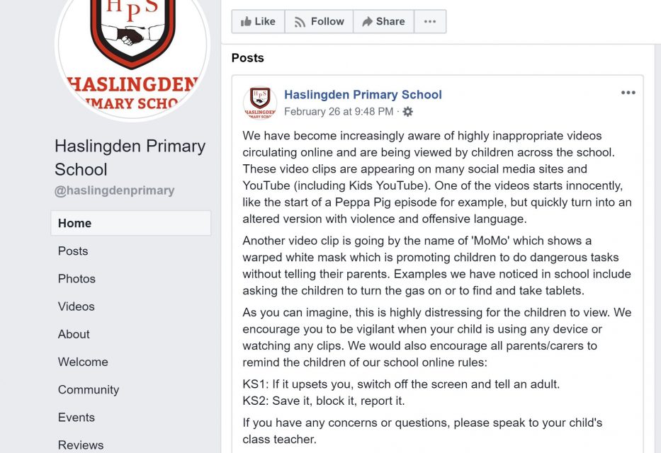 The Haslingden Primary School also warned of children’s videos shown on Youtube being spliced to include the “Momo challenge.”