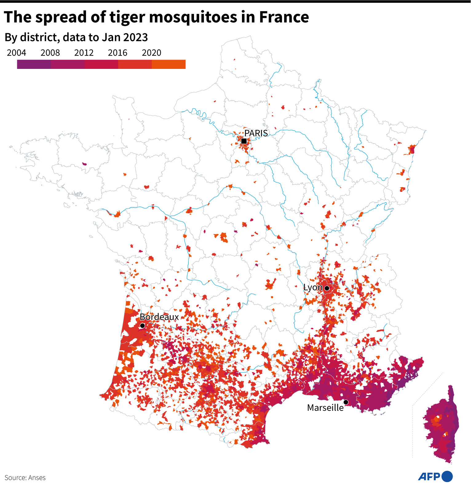 After first being spotted in France in 2004, it is now present in 71 of its 96 departments on the mainland, even in areas close to the northern Channel coast, according to health ministry data.