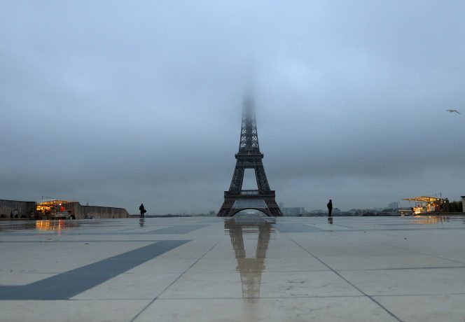 Paris shows the Eiffel tower in heavy fog