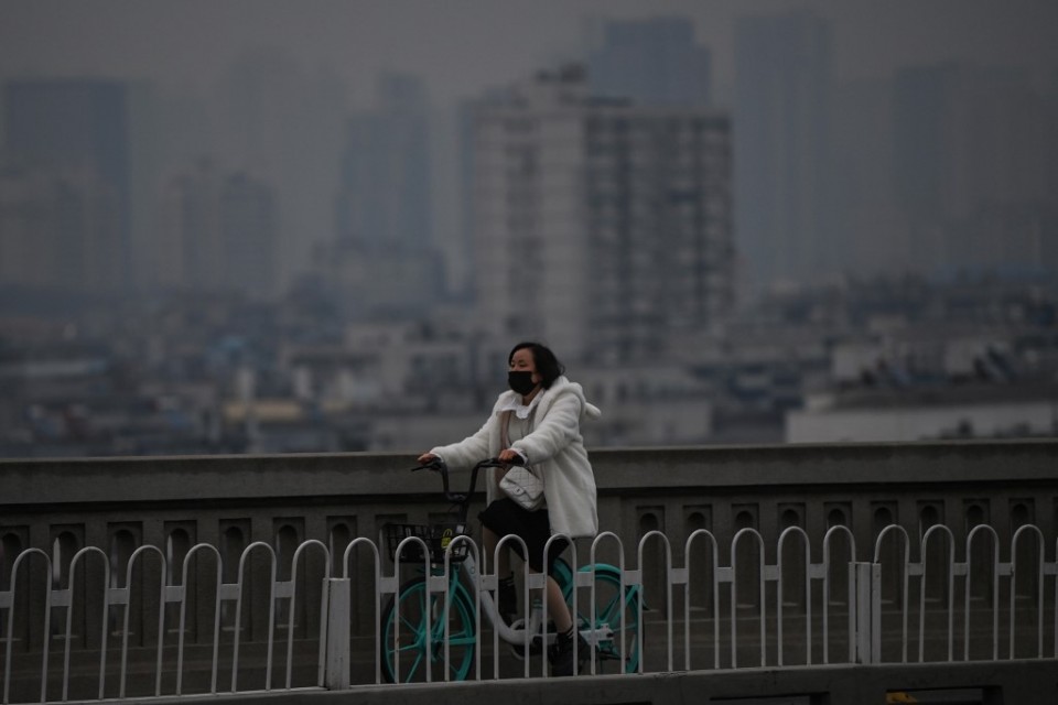 A woman wearing a face mask as a preventive measure against the Covid-19 coronavirus rides a bicycle on Wuhan Bridge over Yangtze River in Wuhan, China’s central Hubei province on January 20, 2021. (Photo by Hector RETAMAL / AFP)