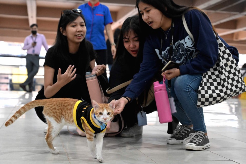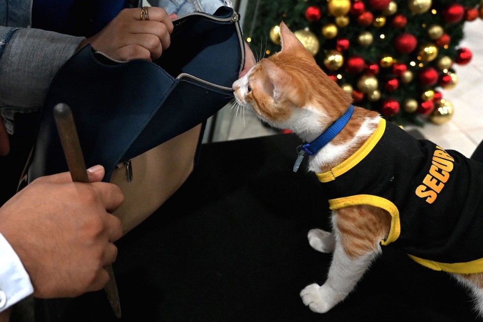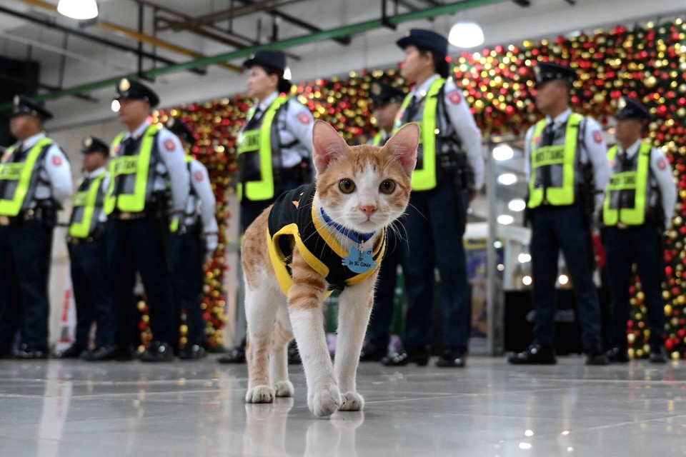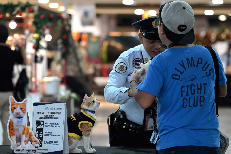 MANILA, Sept 30, 2023 (AFP) – A cat wearing a black-and-yellow security vest strolls nonchalantly past security guards lined outside a Philippine office building waiting to receive instructions for their shift.