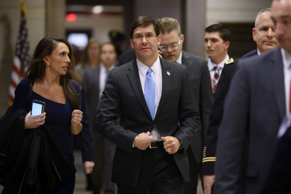 US Defense Secretary Mark Esper (C) leaves the Congressional Auditorium on Capitol Hill in Washington, DC, on January 8, 2020, after a closed briefing on the operation that led to the death of Iranian General Qassem Soleimani. – World leaders have condemned the Iranian missile strikes, which targeted the sprawling Ain al-Asad airbase in western Iraq and a base in Arbil, both housing American and other foreign troops deployed as part of a US-led coalition fighting the remnants of the Islamic State group. (Photo by JIM WATSON / AFP)
