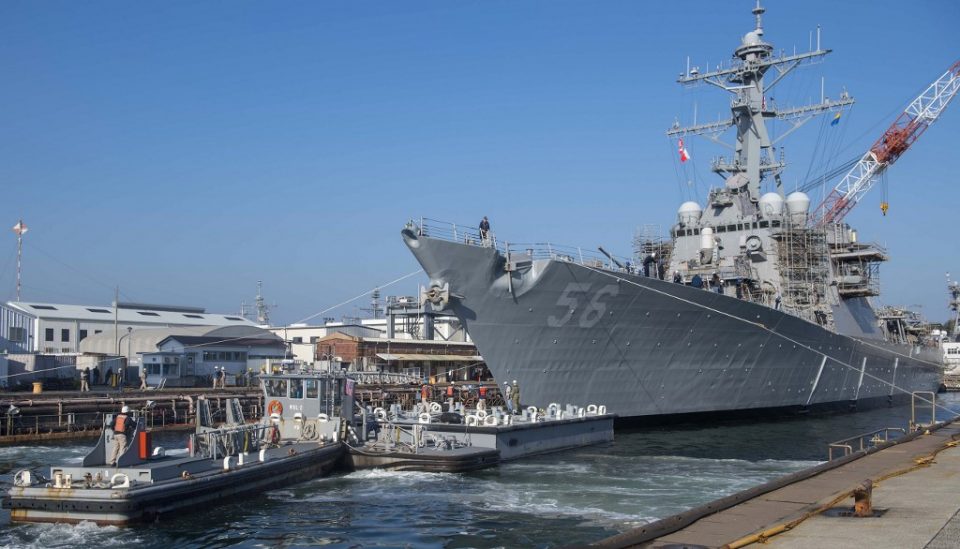 (FILES) In this file handout photo released by the US Navy on November 27, 2018 the Arleigh Burke-class guided missile destroyer USS John S. McCain (DDG 56) prepares to depart from a dry dock at Fleet Activities Yokosuka, Japan. – The White House requested a Navy ship bearing the name of US President Donald Trump’s late rival senator John McCain be kept “out of sight” during a recent presidential trip to Japan, the Wall Street Journal reported on May 29, 2019. “USS John McCain needs to be out of sight,” a Navy official instructed in an email about the visit, according to the newspaper. (Photo by Tyra WATSON / US NAVY / AFP) /
