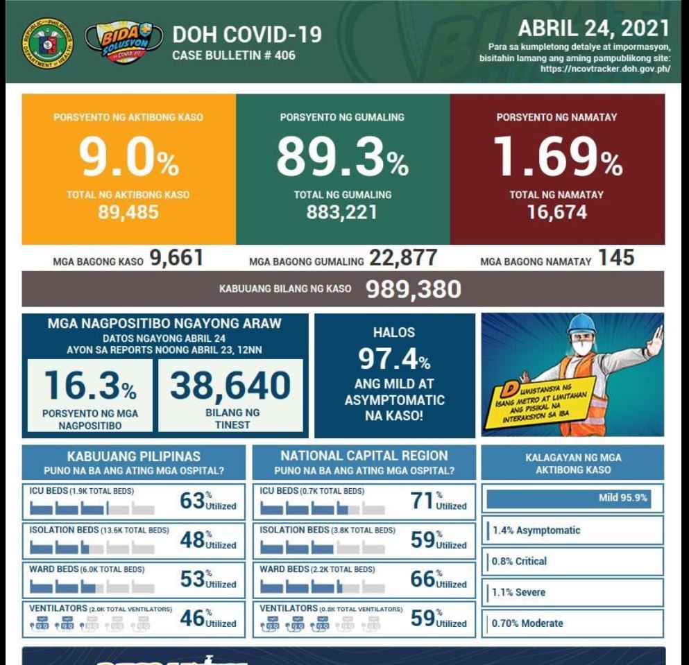 (Eagle News) – The percentage of active cases compared to total COVID-19 cases continued its decline from 10.5 percent on Friday, April 23, to just 9 percent on Saturday, April 24, with the addition of 9,661 cases. This brought the total active cases to 89,485.
