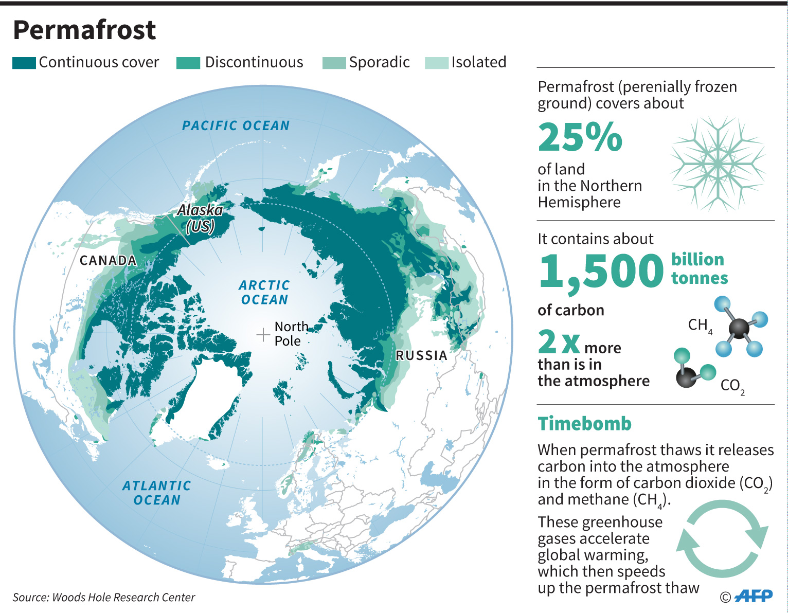 Sometimes called a climate change time bomb, the northern hemisphere’s 15 million square kilometres (six million square miles) of increasingly misnamed permafrost contains roughly twice as much carbon — mainly in the form of methane and carbon dioxide (CO2) — as Earth’s atmosphere.