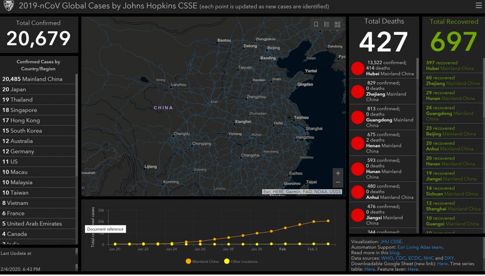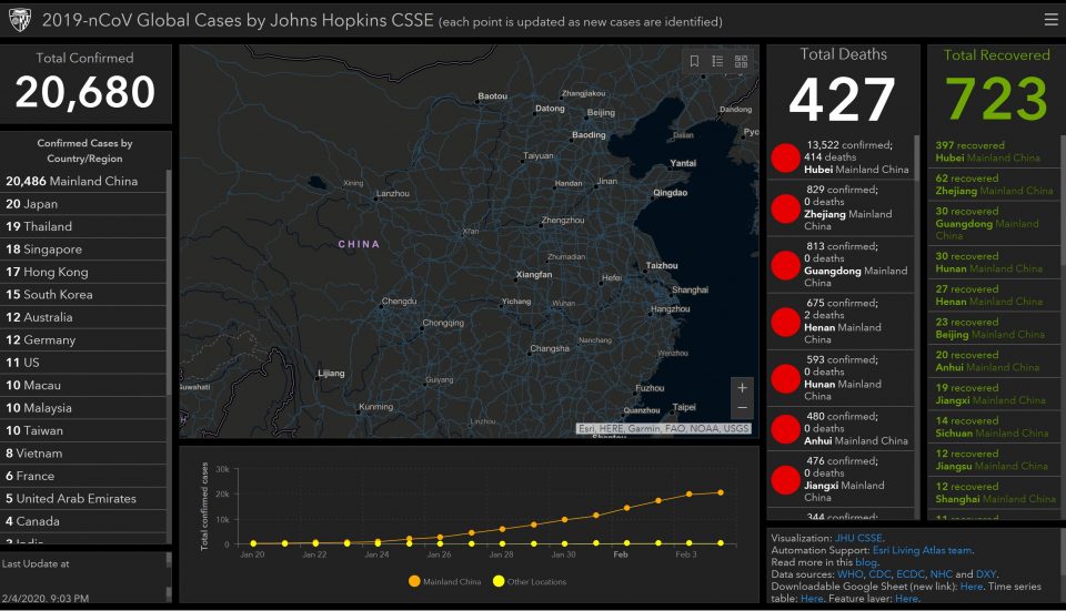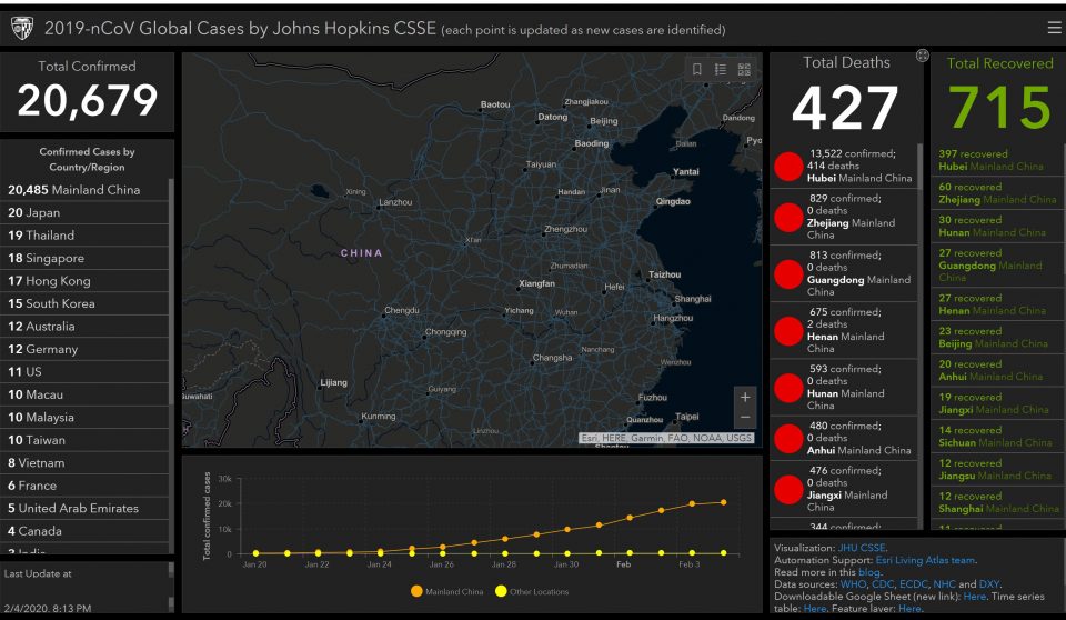 Screenshot of live virus dashboard of the John Hopkins University analyzing and collating data on novel coronavirus cases worldwide. (Screenshot as of Feb. 4 data at 8:15 p.m./Courtesy John Hopkins University)