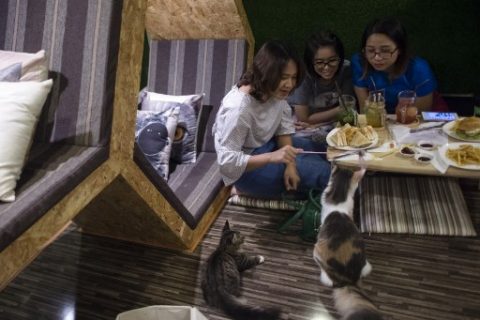 “I used to have cats at home when I was young,” said 23-year-old customer Arr Pouk as he teased four moggies with a feather on a stick. “I love them.”