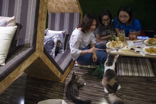 “I used to have cats at home when I was young,” said 23-year-old customer Arr Pouk as he teased four moggies with a feather on a stick. “I love them.”