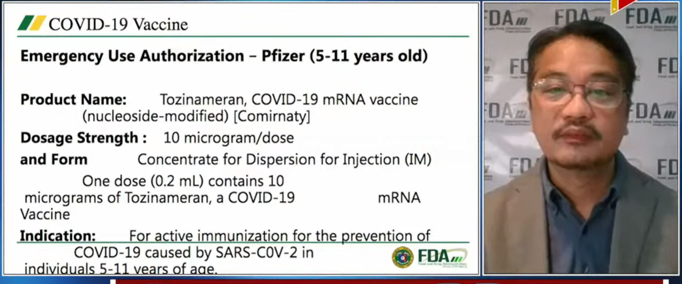 FDA Director-General Undersecretary Eric Domingo said that they have already approved the emergency use authority (EUA) for the administration of Pfizer vaccine doses to those aged 5 to 11, citing the vaccine’s over 90 percent efficacy.