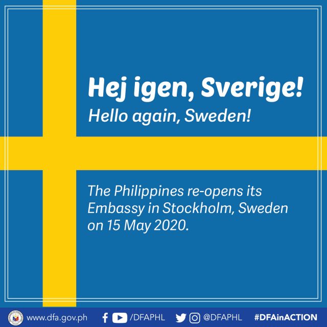 “Eight years after it closed the embassy in Sweden, the Department of Foreign Affairs (DFA) has reopened the Philippine Embassy in Stockholm and will initially start offering consular services to Filipinos in Sweden and Finland,” the DFA said in a statement.