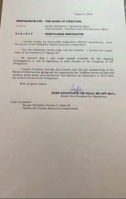 In a letter sent to PhilHealth Chief Ricardo Morales, a copy of which was also given to Senate President Tito Sotto, Augustus de Villa said he was tendering his “irrevocable resignation” as senior vice president for operations effective immediately but did not state the reason.
