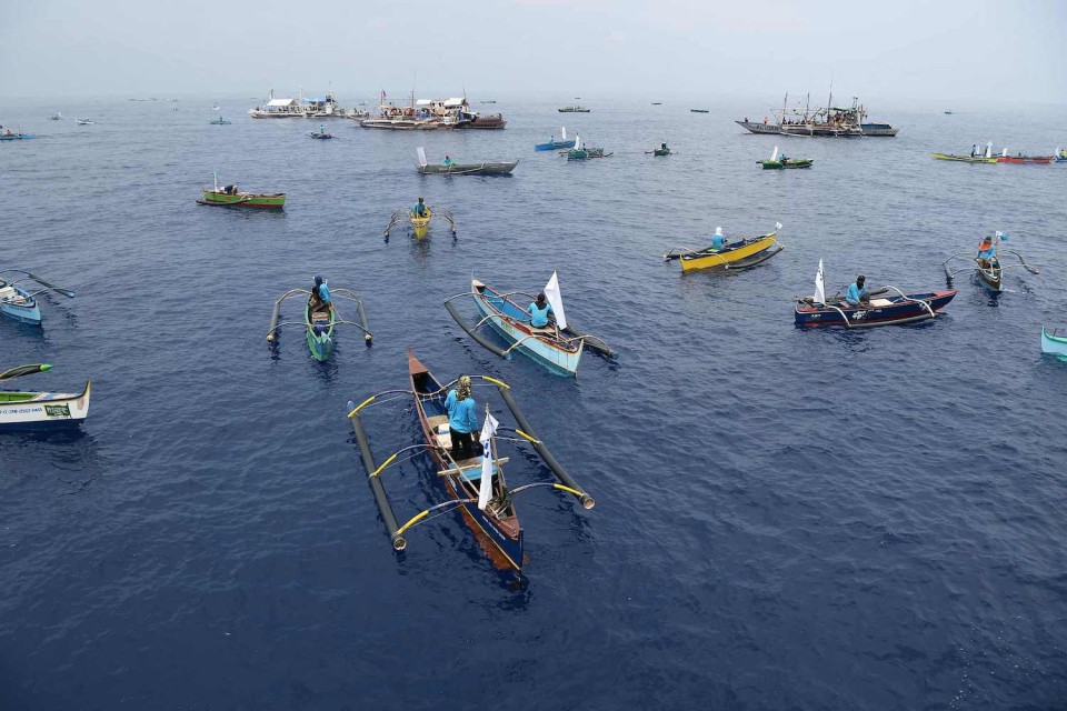 Philippine fishermen along with volunteers from a civilian-led mission Atin Ito (Itís Ours) Coalition aboard fishing boats arrive at a meeting point in South China Sea on May 15, 2024. Civilians on board Philippine fishing boats sailed on May 15 towards a China-controlled reef off the Southeast Asian country to distribute provisions to Filipino fishermen and assert their rights to the disputed waterway. (Photo by Ted ALJIBE / AFP)