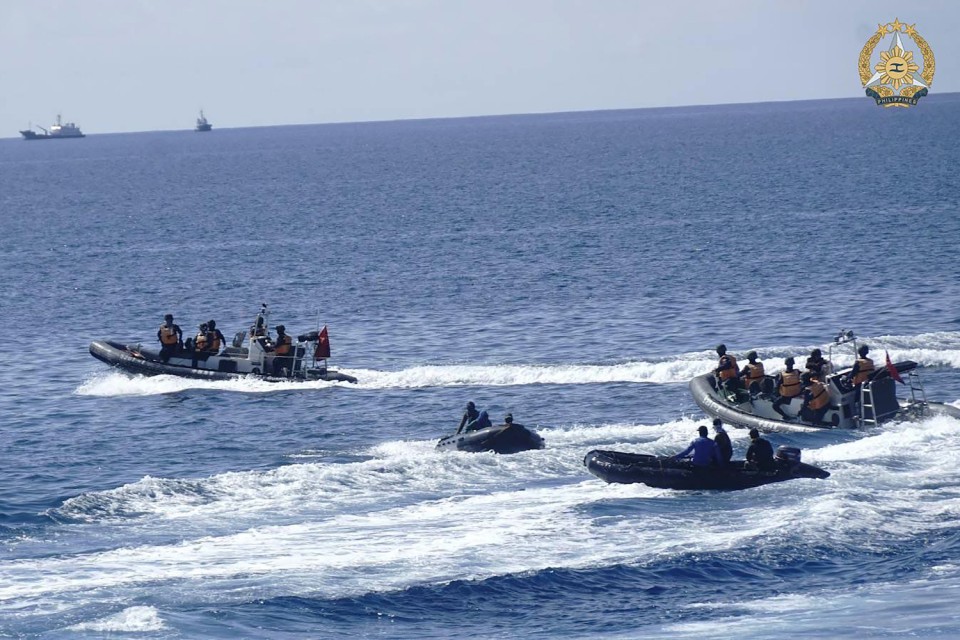 This handout photo taken on May 19, 2024 and received on June 4, 2024 from the Armed Forces of the Philippines shows two Chinese rigid-hulled inflatable boats (L and R) maneuvering close to Philippine personnel on board their boats (2nd L and 2nd R) near the Philippine outpost at Second Second Thomas Shoal in disputed waters of the South China Sea. – As two Philippine vessels meet on the high seas to transfer a sick Filipino soldier, China Coast Guard boats shadow, block and bump them, according to video released by the Philippine Coast Guard on Friday. (Photo by Handout / ARMED FORCES OF THE PHILIPPINES / AFP)