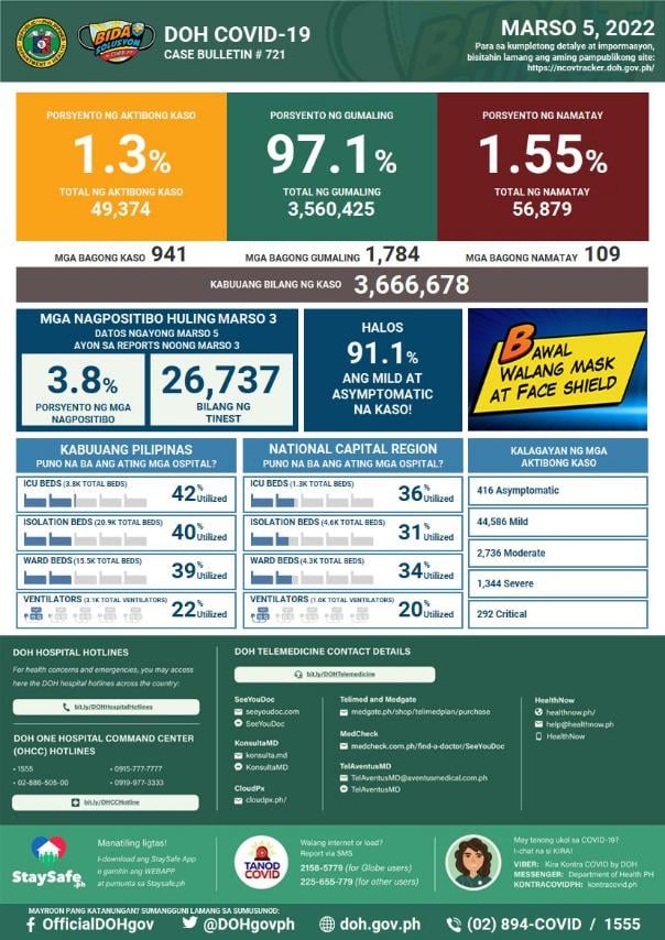 (Eagle News) — COVID-19 cases in the Philippines rose to 3,666,678 on Saturday, March 5, after the Department of Health reported 941 additional cases.