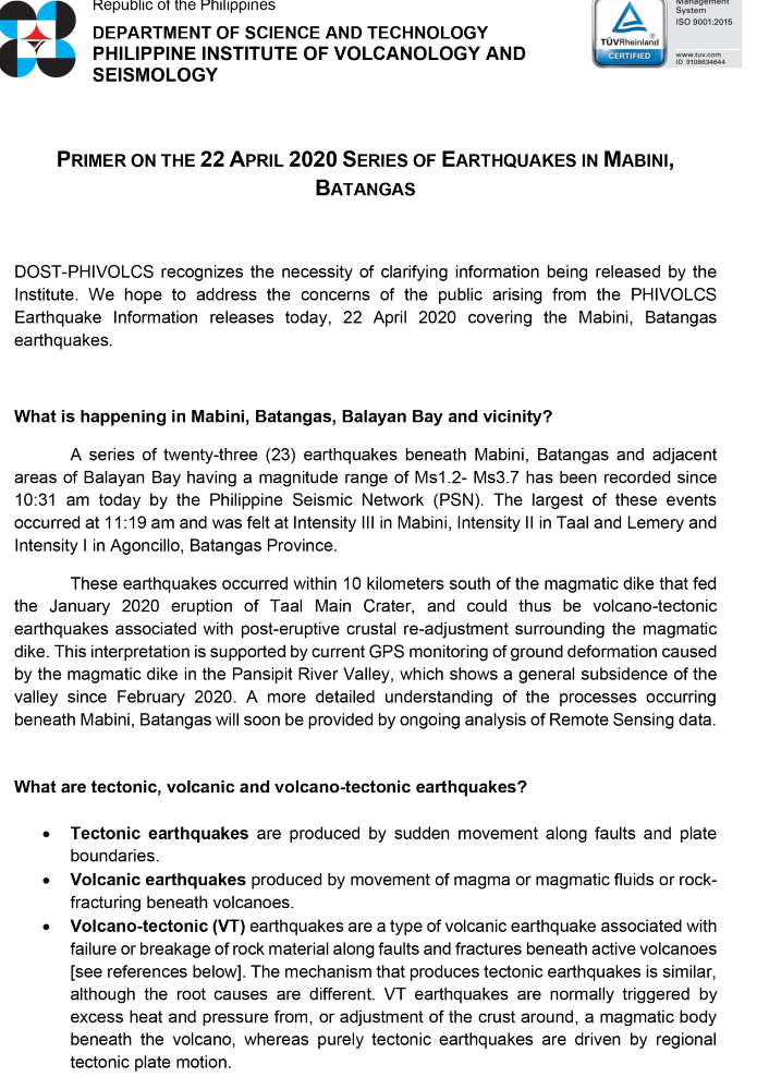 (Eagle News)–The series of earthquakes that hit Batangas on Wednesday, April 22, are volcano-tectonic in origin.