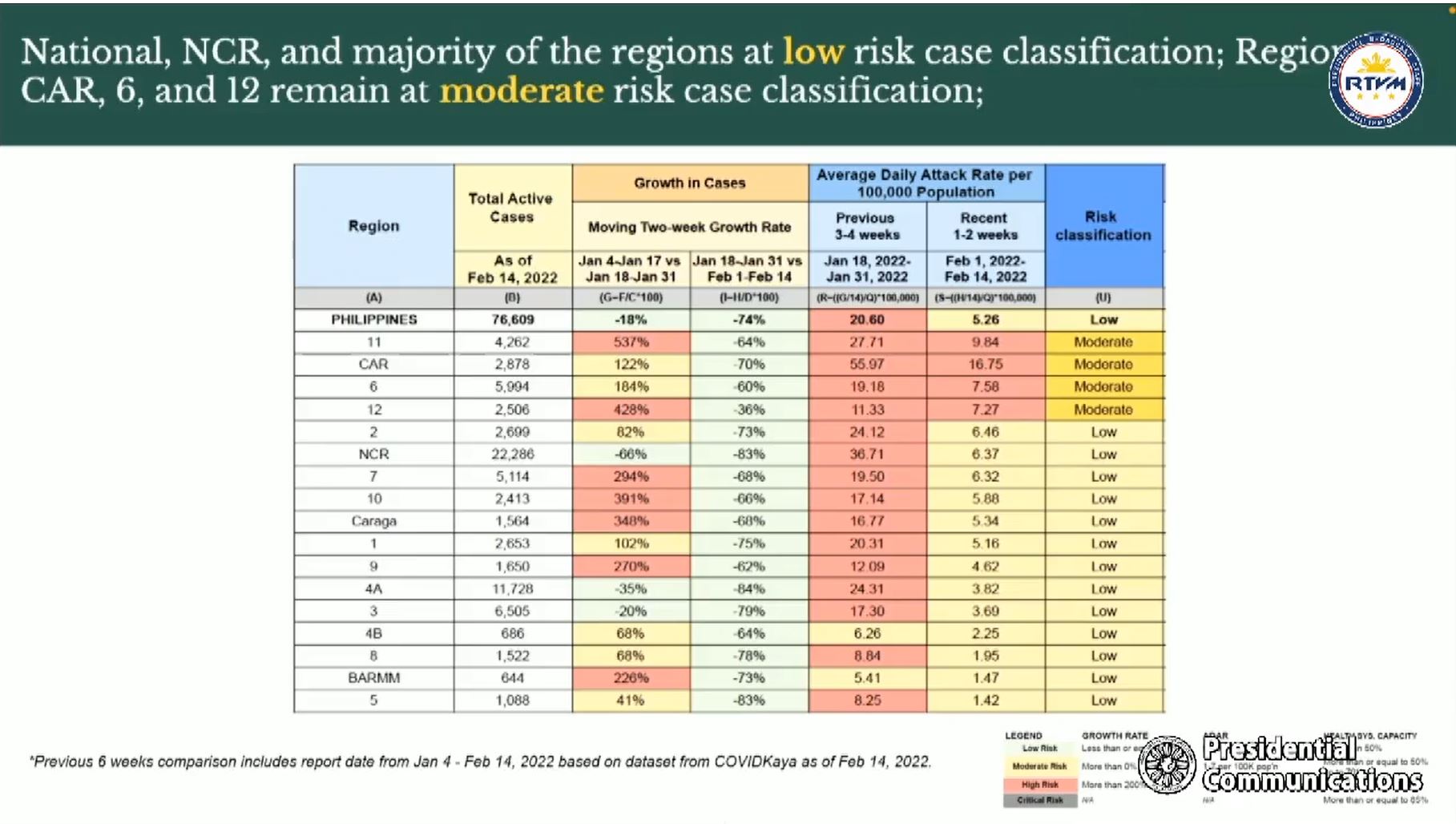“So bilang pagbubuod, Mr. President, now, country is at low risk classification. Meanwhile, may apat na regions at moderate risk,” he said.