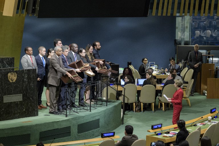 In this image obtained from the UN, conference officers hold up empty ballot boxes before collecting ballots from delegates at the election of new members of the UN Human Rights Council on October 12, 2018 at the UN in New York. – Bahrain, Cameroon and the Philippines were among a number of nations controversially elected to the United Nations Human Rights Council on Friday, sparking sharp criticism from rights groups. “By putting forward serious rights violators and presenting only as many candidates as seats available, the regional groups risk undermining the council’s credibility and effectiveness,” said New York-based Human Rights Watch. (Photo by Manuel ELIAS / UNITED NATIONS / AFP)