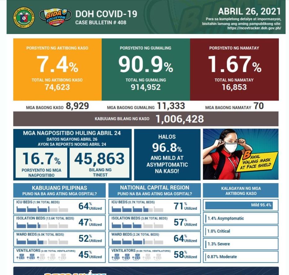 (Eagle News) – Philippine COVID-19 cases breached 1 million on Monday, April 26, with the addition of 8,929 cases, the Department of Health reported.