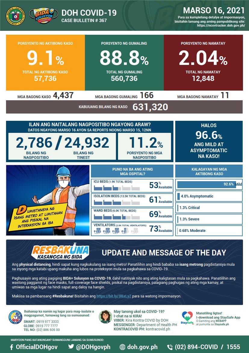According to DOH data, the 4,437 additional cases also pushed the confirmed COVID-19 cases to 631,320.