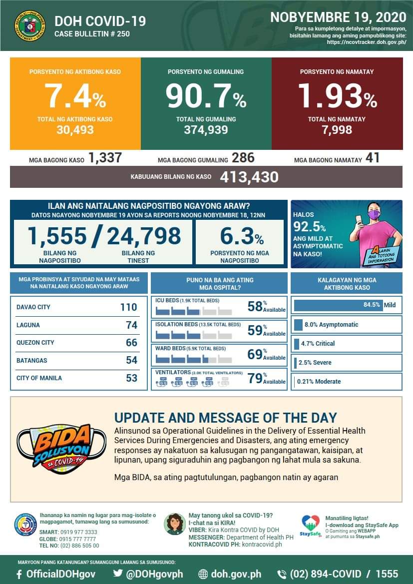 (Eagle News)–COVID-19 cases in the country breached the 413,000 mark on Thursday, Nov. 19, after the Department of Health reported 1337 additional cases.