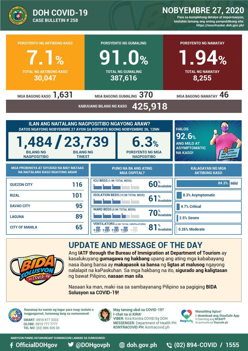 (Eagle News) — COVID-19 cases in the country breached the 427000 mark on Saturday, Nov. 28, after the Department of Health reported over 1,000 additional cases.