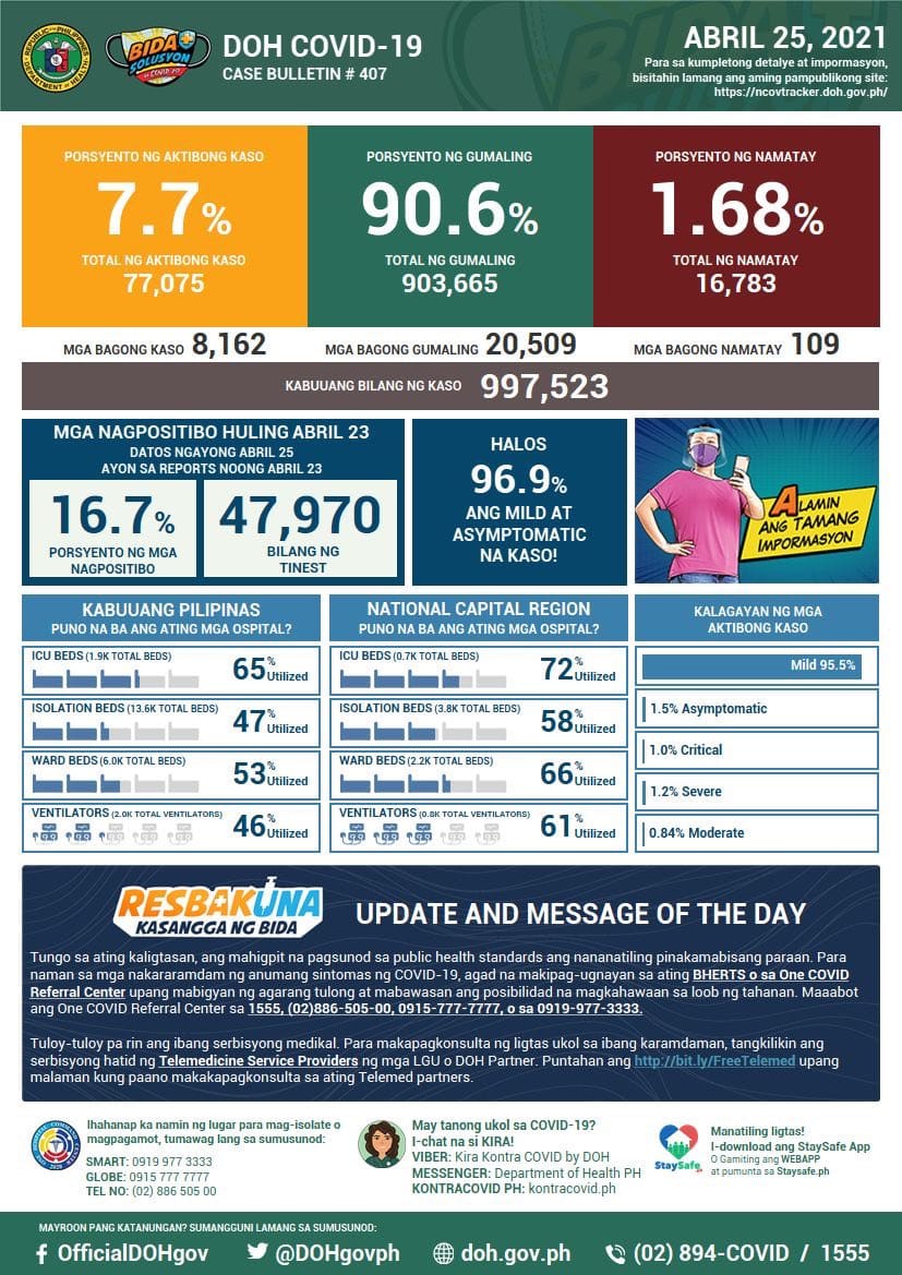 (Eagle News) — The number of COVID-19 cases in the Philippines breached the 997,000 mark on Sunday, April 25, after the Department of Health reported 8162 additional cases.