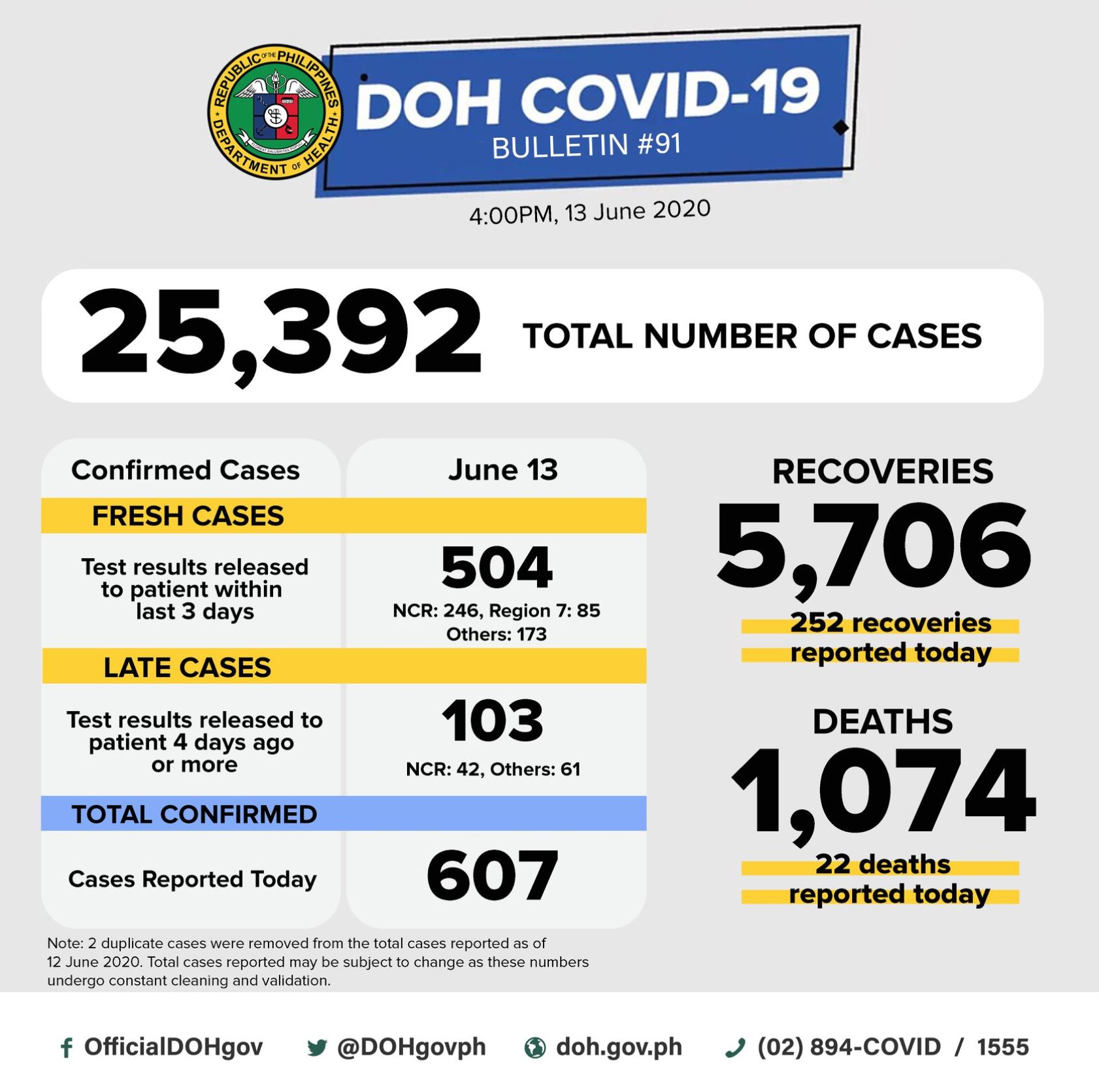 (Eagle News) – COVID-19 cases in the country continued to rise with the addition of 607 cases on Saturday, June 13, bringing the total cases to 25,392, according to the Department of Health (DOH).