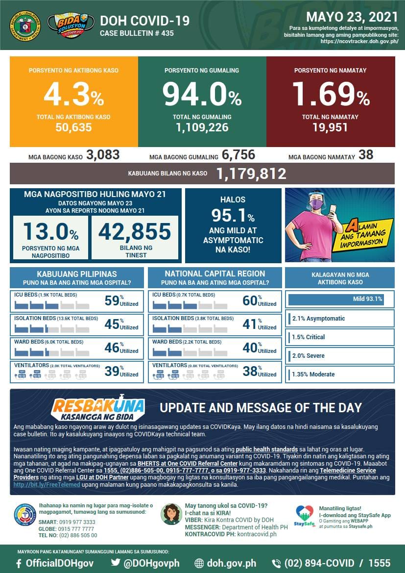 (Eagle News) — COVID-19 cases in the Philippines reached 1,179,812 on Sunday, May 23, after the Department of Health reported 3,083 additional cases.