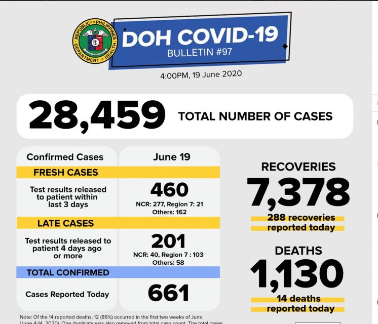 (Eagle News) — The number of COVID-19 cases in the country reached 28,459 as more fresh cases were reported on Friday, June 19, at 460, most of them in Metro Manila, according to the Department of Health.