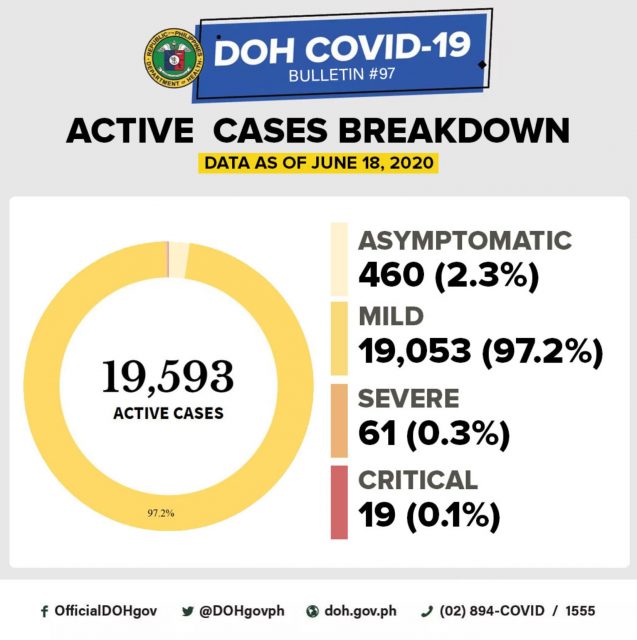 The DOH also said that most of the country’s active cases are considered “mild”. In fact, in its update as of June 18 data, it said that 97.2 percent of the 10,593 active cases in the country are mild cases.