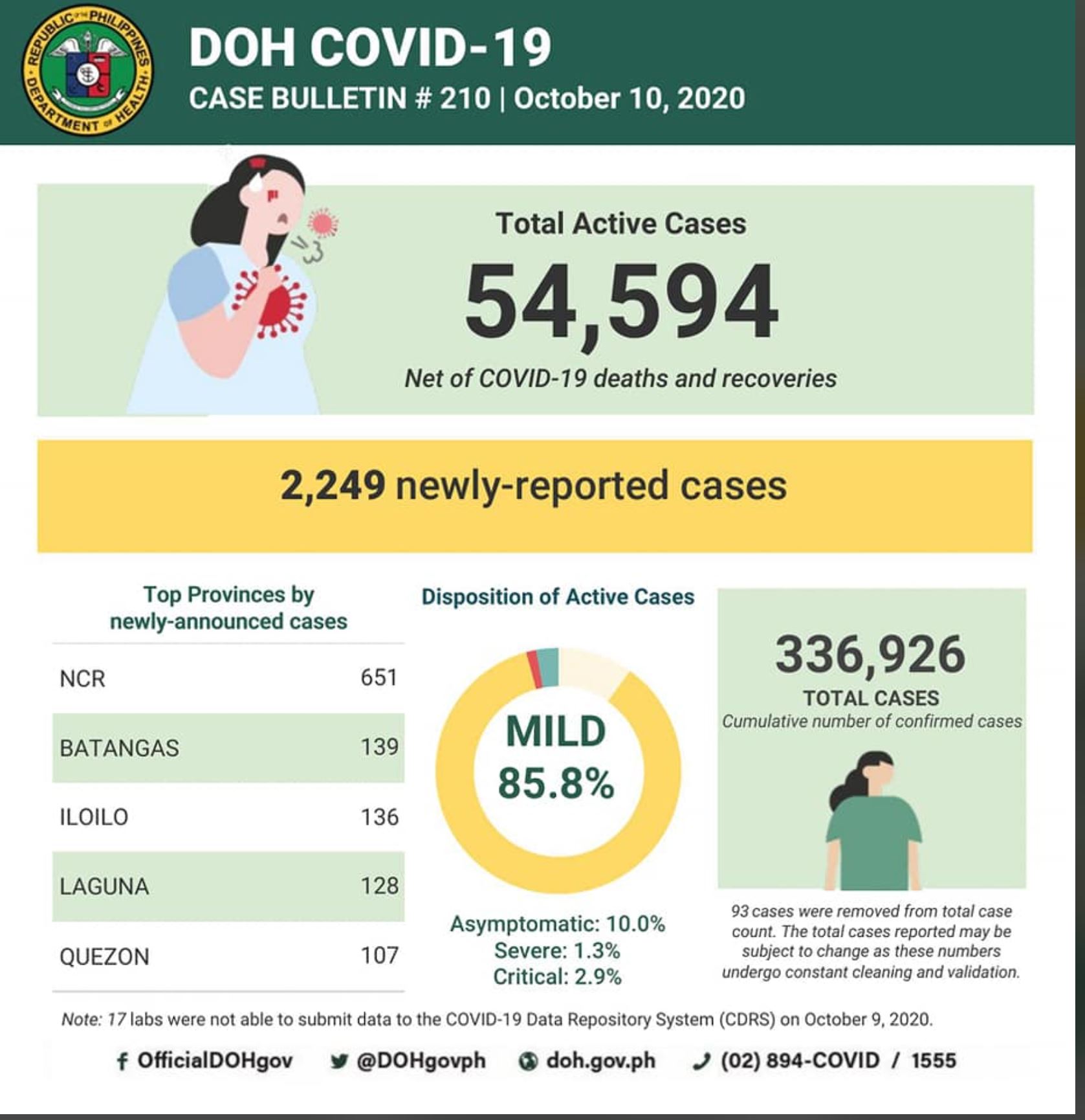 (Eagle News) – The country’s COVID-19 cases reached 336,926 on Saturday, Oct. 10, as virus-related fatalities hit 6,238 as the Philippines maintained its 19th place among countries with high coronavirus cases.