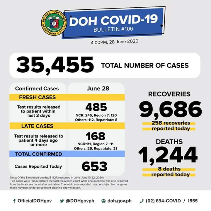 According to the DOH, of the 485 fresh cases, 245 were from Metro Manila, 120 from Region VII, 112 from other areas and eight from repatriates.