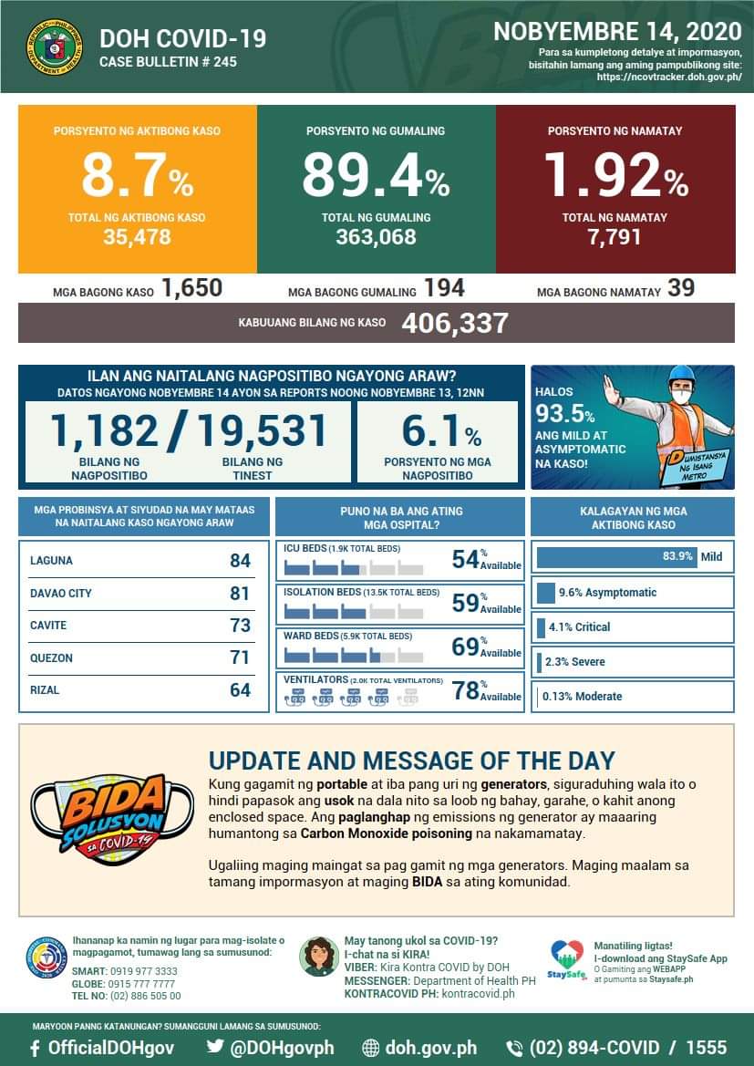The DOH said of the 406337 total cases, 35478 were active.